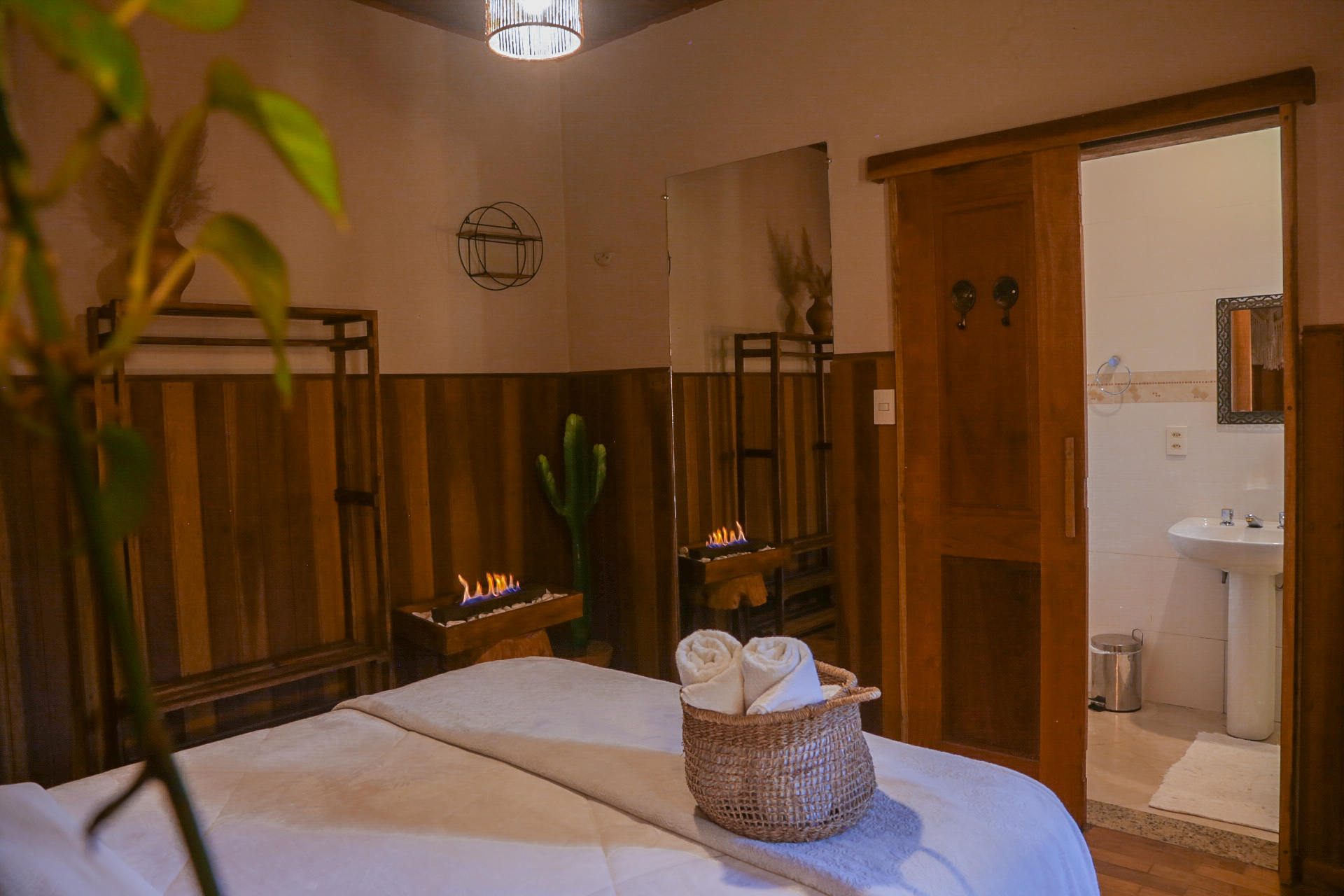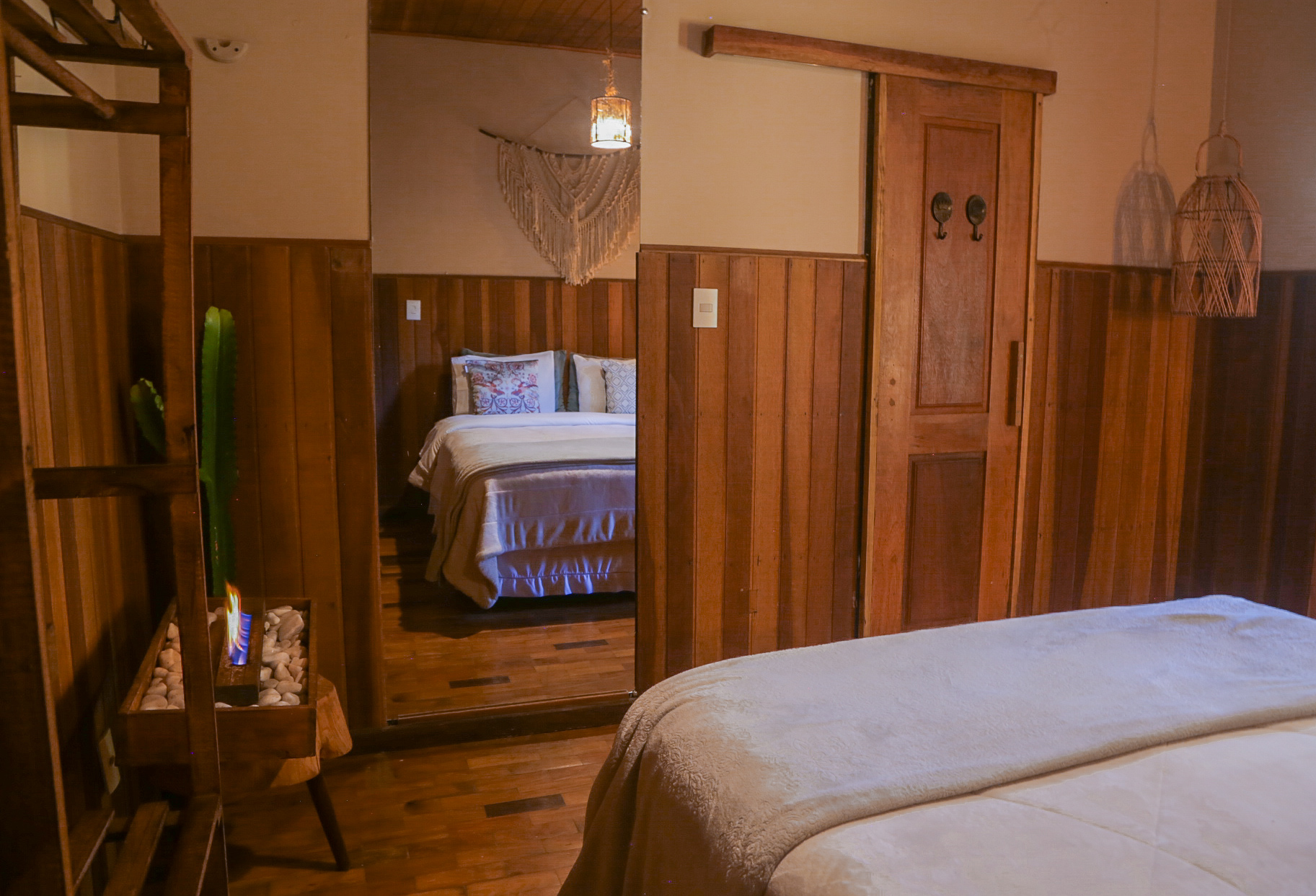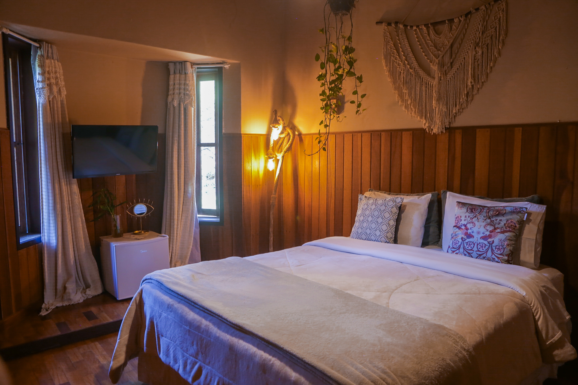A Suíte Firefly é um espaço acolhedor, com decoração em estilo boho chic e atmosfera tranquila, ideal para quem busca descanso, leveza e conexão com a natureza.